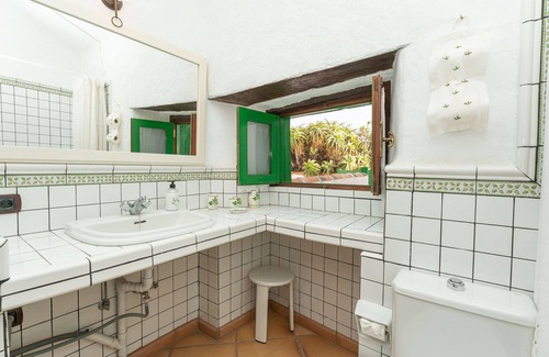 The holiday cottage is in a residential area with various houses, all retaining the traditional Canarian architectural style. They feature thick stone walls and white varnished wooden elements. Each house benefits from its own garden with native plants. The house has a wood paneled ceiling, and the terrace Arabic style tiling.