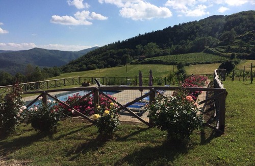 The farmhouse Poggio del Fabbro is located in San Pietro a Dame, a hamlet of the municipality of Cortona in the mountains of Cortona, 20km from the city, in a quiet and isolated position in the green mountains at an altitude of 700m above sea level on the border between Tuscany and Umbria.It is in the centre of a farm of about 65ha mainly composed of woods but also cultivated land.The farm's main products in addition to wood are: wine, oil, cereals, chestnuts, a small herd of sheep and farmyard animals (poultry and rabbits).It is the ideal place for those who want to spend a relaxing holiday away from the chaotic city noise.The farmhouse is located in a house dating back to about the end of the 19th century, renovated in 2011 while maintaining the original features.The house is about 90 sq m on 3 levels, where on the ground floor we find the kitchen equipped with dishwasher, oven, 4-burner stove, fridge with small freezer, toaster etc...... the living room with table, sofa bed, closed fireplace and satellite TV.On the first floor there is a double room, a single room and a bathroom with shower.on the second floor there is a double room, a single room which can be transformed into a double room if necessary, and a bathroom with shower.outside there is a 1000sqm fenced garden with a private swimming pool, barbecue, gazebo, sunbeds and some games for children.the last 1500metres of road for access to the house are not asphalted