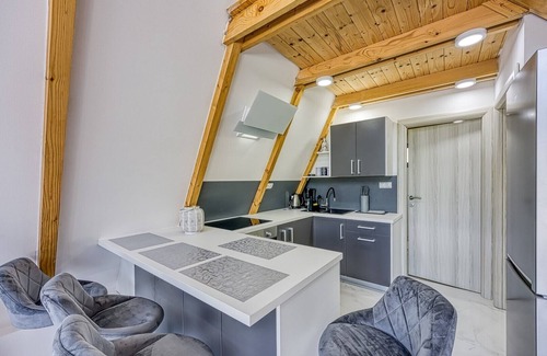 The interior of the house is modernly decorated, with large glass windows that provide plenty of natural light and beautiful panoramic views of the surrounding landscape. The spacious living room and kitchen are equipped with all the necessary facilities for a pleasant stay. The house has two comfortable bedrooms and a modern bathroom, ideal for a family or group of friends looking for peace and comfort.