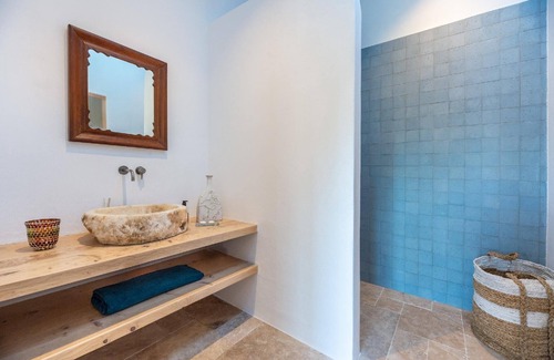 The sweeping staircase connects the villa to a beautiful pool area, which comprises a swimming pool with Formentera-coloured stone, a water cascade, chill-out lounge, large dining area (for 10-12 people, under bamboo roof), bar, wood/charcoal barbecue, sun loungers, bathroom, indoor & outdoor shower and kitchen.