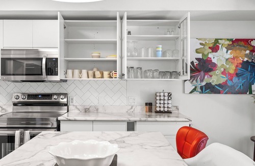 The suite features two comfortable bedrooms (one with a queen, the other with a queen + bunk beds), a bright sunroom filled with natural light, and a spacious living room with free Wi-Fi and TV. Step outside to a large private backyard—perfect for children to play freely or for adults to unwind with a glass of wine after a day of exploring.