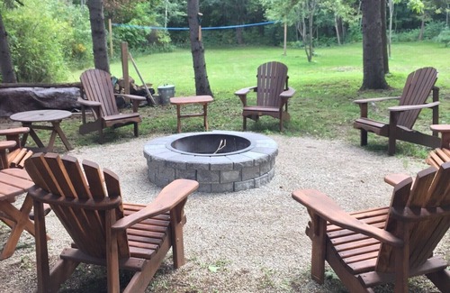 Fire pit with sturdy Adirondack chairs, cushions and tables.