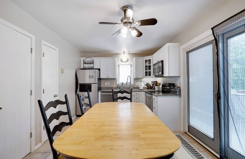 Perfect for a getaway anytime of the year, this home is fully furnished, sleeps 8-10 people with 3 bedrooms, 2.5 baths, fully equipped kitchen, large deck, three season screened-in porch, outdoor fire pit, large gravel driveway for parking, dvds, games, kids toys, washer/dryer, roku streaming devices, wifi and more. Also includes two separate work areas with monitors. It has everything needed for a comfortable long term stay.