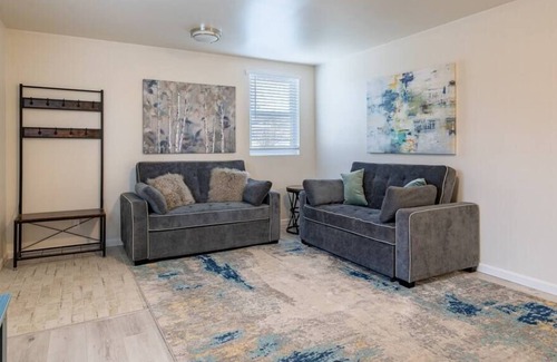 The cozy family room features a 65” 4K Smart TV and a desk that can serve as a convenient workstation for you if you need to get some work done during your stay. The two comfortable couches make the space a great place to catch up on your favorite shows or watch a movie.
