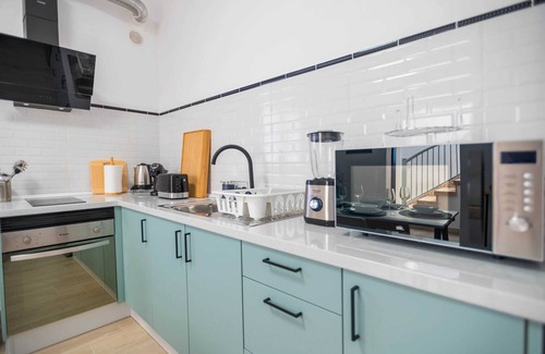 The holiday home features an inviting living area with a comfortable sofa and dining table for cozy meals. The open-plan kitchen is fully equipped with modern appliances so you can prepare your meals just like at home. Supply of cleaning materials ensures you always have what you need at hand.
