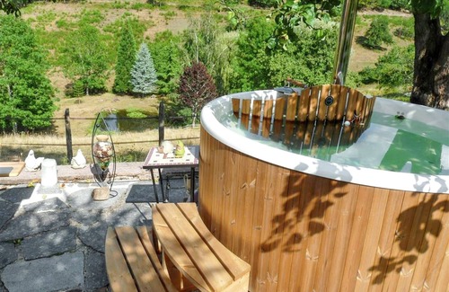 The house is surrounded by a fenced garden that provides a peaceful and natural setting. Relax on two terraces equipped with sun loungers, perfect for al fresco dining or leisurely moments. Additionally, a fire pit and a plancha are available for grilling while you enjoy stunning views of the surrounding mountains and pond. It’s an ideal spot to bask in the sunny days! For an extra option, a Swedish bath can be prepared for one or two evenings, heated to 37 degrees with natural spring water.