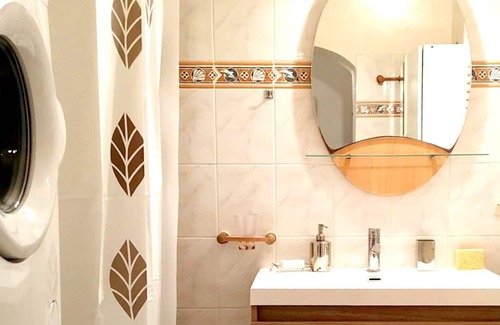 The apartment features a washing machine, cleaning products, a vacuum cleaner, a fan, a dressing room, central heating and ironing equipment.