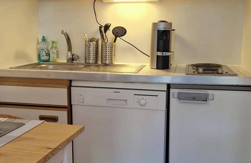 This charming studio covers 25 m² and features a practical kitchenette equipped with a stove, microwave, dishwasher, and all necessary kitchen utensils. Relax in the living area with a comfortable sofa and flat-screen TV. A cozy sleeping area with bunk beds promises restful nights, while the bathroom is modern, with a shower and toilet, ensuring all essential comforts are at hand.