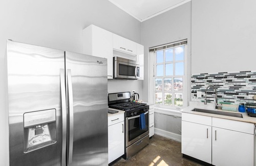 You will immediately be welcomed by the open light-filled space with breath taking view of downtown Birmingham. With our comfy sofa, modern decor, coffee table to set drinks and snacks on, and a smart TV, this living room will be your perfect spot to unwind after a day of exploring all Birmingham has to offer.