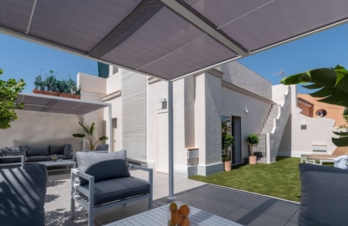 This wonderful apartment is designed for your comfort and convenience. Recently renovated with high qualities and furnished with designer furniture, perfectly equipped with everything you need for a dream stay: 43' TV, comfortable sofa bed in the living room, fully equipped kitchen with NESPRESSO with welcome kit (coffee, tea and milk), microwave, washing machine, vitroceramic and a complete set of utensils. The room has a large and comfortable bed with a light Nordic duvet. All linen is 100% cotton. In the bright and pleasant apartment there is a very quaint courtyard with plants and seating area to have a drink. The bathroom, with marble floor and LED lighting, has a large shower tray with gel dispenser - high quality shampoo and a large mirror. If you need it, you have iron, ironing board, clotheshorse and all the cleaning items you may need. The apartment is equipped with a quiet central air conditioning. If you come with babies we can provide you with COT and HIGH CHAIR free of charge. In the building we have a large terrace for common use for all guests of the building. Equipped with sofas in several areas to relax and sunbeds to enjoy the sun.