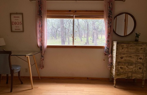 This suite is located on the ground floor of our largest farmhouse style cottage. It has a private entrance and back porch, as well as access to our freshly remodeled bathroom and rainfall shower. Enjoy the tranquility of the hill country with breathtaking nature views.