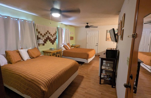 Our Family Suite comes with three queen-sized beds. This suite includes fresh linens, a television with streaming capabilities, a microwave, and small refrigerator. Private bathroom with tub and shower. Private entrance to room. Large enough to accommodate 6 guests. Breakfast available for all guests at 8 am. .