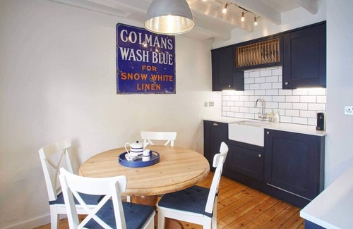 On entering the property you are presented with a small entrance hall, synonymous with fisherman houses. To the right you have the cosy living area. This space features deep teal sofas, a traditional open fire and hard wood floors. Overhead you have the original beams and a decorative chandelier. Enjoy an evening in front of the tv or make plans for your day ahead in these gorgeous, characteristic surroundings.