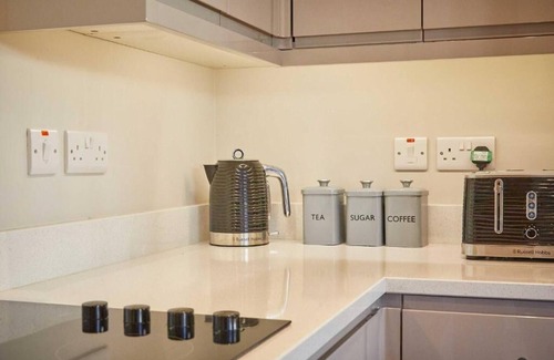 Continue through the double doors and you’ll find the open plan kitchen diner. Both practical and stylish, the kitchen has high shine, dove grey cabinets and modern appliances. You can make use of the oven, hob, fridge freezer, microwave, toaster and kettle during your stay. Enjoy your homemade meals at the dining area which includes a solid wood table with black metal legs, matching benches and grey leather chairs.