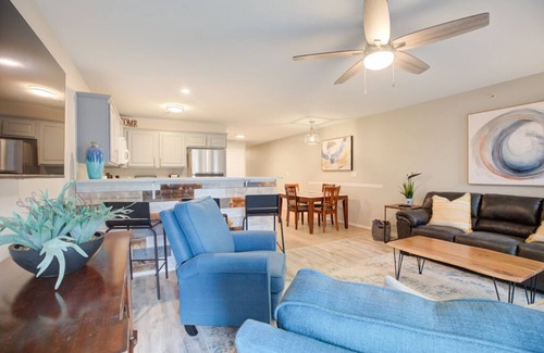 Riverside Landing is a privately owned condo at Waterwheel Condominiums on the Guadalupe River in New Braunfels. This 2nd-floor, 2-bedroom, 2-bath condo sits with a balcony overlooking the courtyard pool. You'll enjoy two pools (one of which is heated) and 4 hot tubs, private Guadalupe river access, and a large expanse of luscious lawn shaded by pecan trees. You're conveniently close to Schlitterbahn, Comal River parks, Guadalupe River parks, downtown, and Historic Gruene.