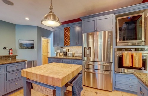 The open floor-plan gourmet kitchen is fully stocked and well-suited for serving large groups. With all stainless appliances, a center butcher-block island, and extended counters and barstool seating that invites gatherings and informal dining around the kitchen.