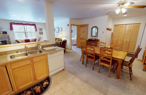 The Lodge At Riverbend 105 is a 2 bedroom, 2 bath condo that sleeps 8. Comfortable first-floor unit that looks out to an aspen grove. Windows let in lots of light Located near the recreation path and near Main Street. Underground assigned parking for two vehicles is just across from the stairs to the first floor or use the elevator from the parking area. A beautiful lodge looking building with extra outdoor patio spaces and large beautiful grounds. Living room features a gas fireplace, flatscreen and lots of windows. Main deck has adirondack chairs for 2. Free WiFi and cable. The dining area seats 6. Full size washer and dryer in unit for convenience.