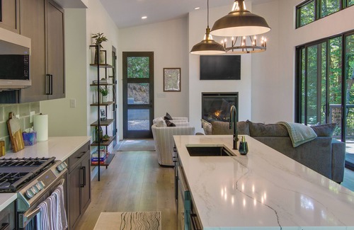 INDOOR LIVING: Smart TV w/ basic cable & streaming services, fireplace, dining table, modern decor, board games