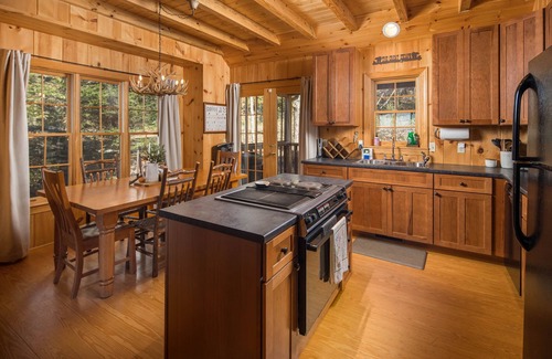 From the moment you step out of your vehicle, the awe-inspiring view is sure to take your breath. From the front porch you’ll find comfy outdoor furniture to relax in and enjoy a morning cup of coffee or evening glass of wine as you enjoy the view. Inside this nicely furnished log home the main level features a welcoming living area with a gas stone fireplace and comfy leather furniture. There’s a large flat-screen TV for watching sports or movies and WIFI is available for those that need to stay in touch with work or just catch up on emails.