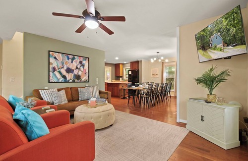 THE MAIN/MIDDLE FLOOR showcases the living room and kitchen space with two decks, one to the propane grill and one to the fire table. The living room contains a smart TV and extra hidden seating in the ottoman. A large dining room table and bar seating allows for family and friends to gather ‘round near the fully stocked kitchen. A traditional drip coffee maker, a French press, and a Keurig single cup coffee maker are provided. The open floor plan enables groups to be together for cooking, dining, and relaxing. This level also includes a King master bedroom with walk-through full bathroom. This bedroom closet contains a booster highchair, a Pack 'n play bed, an audio baby monitor, and nightlights...perfect for a family with little ones. Toddlers and infants are more than welcome to stay, but please be aware that this house is not child-proofed inside or out; young children will need to be watched at all times.