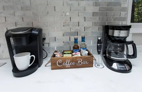 * Kitchen with cooking utensils, pots, pans, appliances, plates, silverware, coffee bar, etc