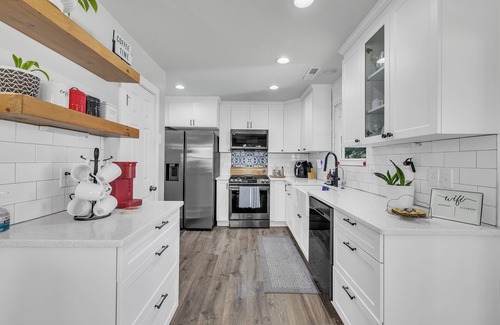 The tranquil garden and play area are perfect for family and friends to gather togheter featuring a hot tub and play area, outside dining area equipped with a grill and griddle. Fully Fenced yard.