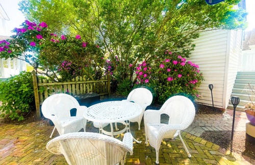 330 feet from the beach, The Beach Club Victorian is a boutique guesthouse with 10 cheerful rooms surrounding a saltwater pool. Each includes a private bath, mini fridge, Keurig, AC, WiFi, and new furniture. Cottage: Bayside features a private entrance, King bed, full bath, seating area and is ground level. Includes beach badges, towels, linens, soap, paper towels, dishwasher pods, hairdryer, iron, and bikes (upon request). No toiletries, beach gear, washer/dryer, or daily cleaning.