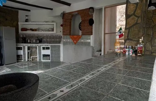 5.- A rustic style kitchen, with gas stove with 4 grills, refrigerator, kitchen utensils, bar, and a dining room.