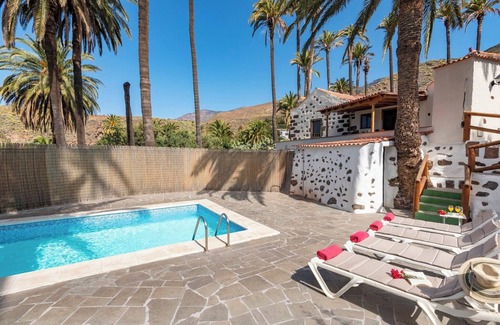 Nestled in the heart of one of Santa Lucia's stunning palm groves, this charming house offers a peaceful retreat surrounded by nature. The idyllic setting provides the perfect environment for a relaxing getaway, whether you're looking to unwind or explore the beauty of Gran Canaria. Inside, the house features a cozy bedroom with a double bed and another with two single beds, making it ideal for small families or couples. The bathroom comes with a refreshing shower, and the well-equipped kitchen ensures you can easily prepare meals. The spacious living room is equipped with satellite TV and a stereo with CD player, offering entertainment options to enjoy in the comfort of your home away from home. While the house is nestled in nature, it's still conveniently located, with parking available just 80 meters away. Take a short drive to explore nearby attractions, such as the charming town of Santa Lucia with its local shops and restaurants, or venture to the picturesque villages and hiking trails in the area for more adventure and natural beauty. Step outside onto the cozy covered terrace, where you can dine al fresco while soaking in the scenic views of the palm grove and surrounding landscapes. The private swimming pool with solarium and sun loungers is perfect for enjoying the sunny weather and relaxing by the water. Whether you’re taking a refreshing dip or simply lounging by the pool, this outdoor space is a serene haven.