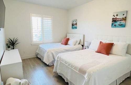 This bright and charming home has space for up to 6 people to sleep; consisting of two doubles, a queen, and a king bed, with plenty of space to store all of your clothes. Whether you’re cooking up a meal in the open concept kitchen, lounging in the spacious living room with access to wifi and streaming, or enjoying the gathering space in the backyard, we hope this can feel like a second home.