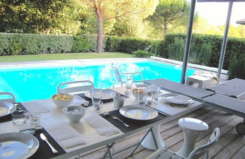(Text automatically translated) . design house in a very quiet and green environment, architecture and interior neat and functional, large covered terraces Saubion is a charming village bakery, newsagent, maraicher 8 kms of Hossegor and 30 km from Biarritz and the Basque Country