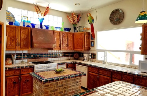 The private courtyard with fountain leads you into the large great room featuring a brick boveda ceiling above the living and dining room. The kitchen is fully equipped including R/O drinking water system. There are three bedrooms, three baths and artist studio which sleeps two. The master bedroom has ocean views while the other two bedrooms and studio overlook and have access to the relaxing courtyard. The patio has a seating area, dining table and outdoor kitchen with a gas grill, sink and small refrigerator. The upstairs margarita deck is great for sunbathing and watching gorgeous sunsets. This home has everything you need for a great relaxing beach vacation. Just bring your clothes, food, beverages and enjoy!