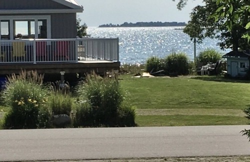 Ideal for kids & Grandparents. Just a 3 to 4 minute walk to a awesome public sand beach park with shallow entry with facilities and lots of other kids. Enjoy this quiet "seaside" hamlet setting with sailboats bobbing in the bay. Awesome Lake Huron sunrises/sunsets await you at this 900 sq.ft. lake view cottage featuring cedar walls & floor , wrap around deck all situated on a double lot. Relax and enjoy the setting. Three "theme bedrooms-await you "the Rainbow Room", The Starlight Room" and "Cloud Nine Room". There is also a small room for storage (in future will be laundry room). Sandy,shallow entry at Howdenvale bay is ideal for kids, and tadpole/frog hunting is fun along the creek. Gov't dock is just a short walk for you and the kids to fish or perhaps buy fresh fish from the fishing boats that arrive around 2pm Yum Yum fresh fish on the BBQ. Canoeing, kayaking or jet skiing. Great fun in the bay or along the scenic shorelines. The Cottage is centrally located to other attractions in the area . There are 5 golf courses within 35 min. drive, great cycling on the miles of paved back roads in the area ,mountain bike trails and ATV trails are right near by. Sauble Beach offers many stores, restaurants and amusement rides within a short 15 min. drive. If you love the "Milky Way" and star gazing - this is for you, No light pollution, bring your s'mores and marshmallows to toast over the firepit and enjoy.