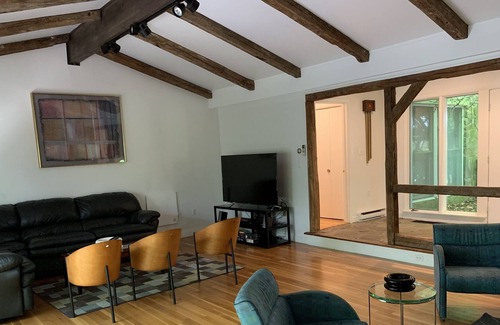 This secluded, air-conditioned, well-appointed property is 90 miles from New York City, and five minutes from the Hudson River. This home and surrounding property is also available for weddings, events and location filming. The very large living room with beamed vaulted ceiling has a stone fireplace for cozy days and nights. Move outside to the spacious decks to enjoy our Hudson Valley skies and beautiful private wooded surroundings. There is a fire pit outside to enjoy the beautiful evenings. The eat-in kitchen and dining room with deck and gas grill make entertaining fun. The arbor covered front deck has wheel chair access to the double front doors. Your master suite has a king-sized bed, walk-in closet, and a large bathroom with shower stall. Two more bedrooms are on the main floor, one queen size and another with two twin sized beds. There is a spacious hall bathroom with double sinks and privacy for the toilet and tub/shower area. The downstairs fireplace is surrounded by a large, entertainment area, a bedroom with two twin beds, and a full size bathroom with tub and shower. The home is equipped with High speed Wi-fi, internet, telephone within the US and 65" Smart HDTV. Large windows in all rooms give the feeling of being in the middle of the trees. Beautiful grounds and views.