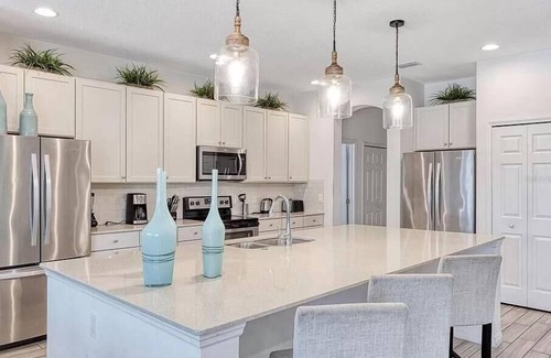 We just purchased this Sprawling Disney Vacation Villa can host more than 30 guests. This upgraded vacation oasis includes a screened, private pool/spa, themed game room, home theater, themed kids bedrooms, 2 laundry rooms, an oversized, modern Chef's Kitchen and oversized kitchen island, 2 refrigerator/freezers, 2 dishwashers, inside and outside dining for dozens of friends and family members. Your Vacation Villa is a destination itself!