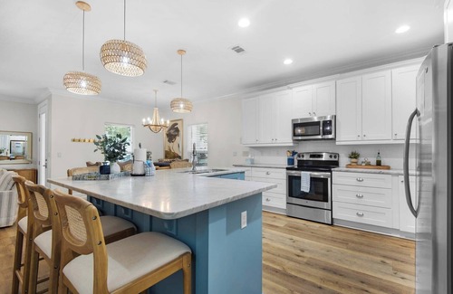 Come enjoy your next vacation at the coastal chic Sandy Feet. This gorgeous 2,350 sqft newly remodeled 4 bedroom, 3.5 bath home in Villages of Crystal Beach features TWO living rooms and TWO King Master Suites, one on each floor! On the first floor you will find your first lovely furnished King Master Suite and on the second floor there is a King Master Suite, a second King guest room, along with a guest bedroom with two sets of built-in twin bunks, and a sleeper sofa on the 2nd floor living room, comfortably sleeping up to 12 guests! This luxurious community is about 500 yds to Crystal Beach and includes a complimentary seasonal trolley service to take you to and from the Gulf. Book your next beach vacation to Sea Salt and see why this should be your home away from home!