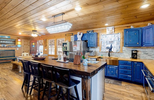 The open, chef’s kitchen features stainless steel appliances, including a double oven and eight-burner gas stovetop, an enormous farmhouse sink, shabby chic blue cabinetry and warm butcher block countertops, including at the large breakfast bar. There’s a dinner bell mounted outside on the deck, so you can call in the troops when it’s time to eat. Dine at the table for six, or grab one of four barstools at the bar or a seat at the high-top table to keep it casual.