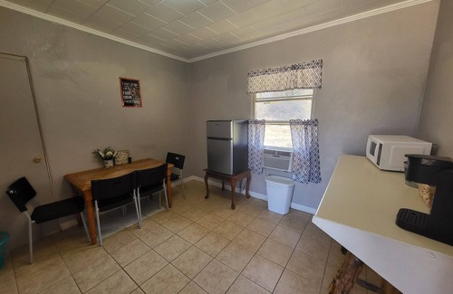 Prepare simple meals and snacks in your convenient small kitchenette, equipped with a microwave, mini-fridge, and a Keurig coffee maker to kickstart your mornings. The small bathroom features a refreshing stand-in shower.