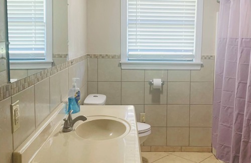 The bathroom includes a spacious vanity, a tub with a shower, and a well-stocked linen closet.