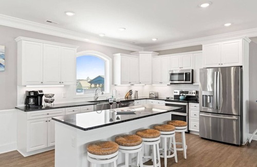 The inverted floor plan places the main living area and gourmet kitchen on the top floor, offering breathtaking ocean views. The kitchen is fully stocked with 3 refrigerators, plenty of prep space, and all essentials for easy home-cooked meals.