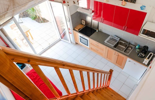 The living room/kitchen area is composed of a fully equipped kitchen unit (3 burner ceramic hob, extractor hood, Senseo coffee pods and traditional coffee maker, oven, microwave, dishwasher, toaster, small fridge with freezer compartment, a table, a sofa, TV (French channels). On the ground floor there is also a small separate bedroom with 2 single beds (2x80x190), and storage space, with a window; a shower room with shower cubicle, washbasin, separate WC.