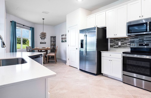 An exquisite NEW spacious 4 bedroom, 2 bathroom showcases GOLF COURSE VIEWS from every window, and is surrounded by water views. Located in Ibis Landing Golf & Country Club, this community is a new 18-hole championship golf course in the Lehigh Acres/Ft. Myers area, with access to shopping, beaches, and tourist attractions in all of SW Florida. The home has every stylish furnishing and provision for an extended comfortable stay to relax and entertain. Enjoy sitting on the large screened-in lanai with outdoor living area and dining table under string light ambiance overlooking the beautiful water and golf views. Guests have access to all amenities, including unlimited golf for two people with a $30 golf cart fee. Amenities to be built are a clubhouse, tennis and pickleball courts, a fitness center, and a swimming pool. Currently, only the golf course is available. Pickleball and tennis courts are being built right now.