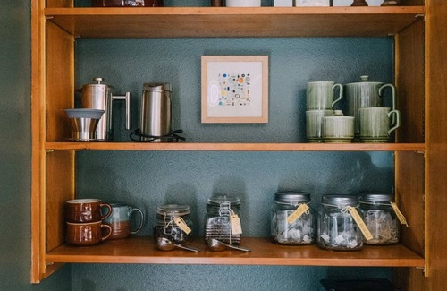 * The guest suite has a queen bed, private exterior entrance, 3/4 bath en suite, TV with Amazon Firestick, and wet bar with a mini fridge and a Keurig.