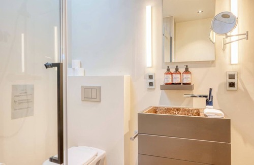 In it's bright corner, you'll find a pristine bathroom complete with a rain head shower, luxurious towels, a hairdryer, and high-quality shampoo, offering all the essentials for a pampering experience.
