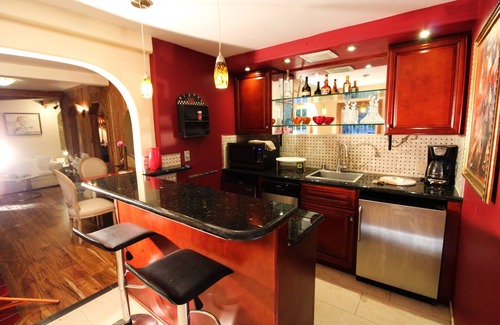 New bar-style kitchen sports cherry cabinets, glass shelving, mirrors and sparkling black granite countertops, stainless steel appliances. Power burner gas cooktop, multi-function convection/microwave oven. Undercounter full refrigerator, separate full freezer, dishwasher, designer deep sink. Fully furnished with dishes, pots & pans, glassware, coffee maker, toaster, blender, etc.