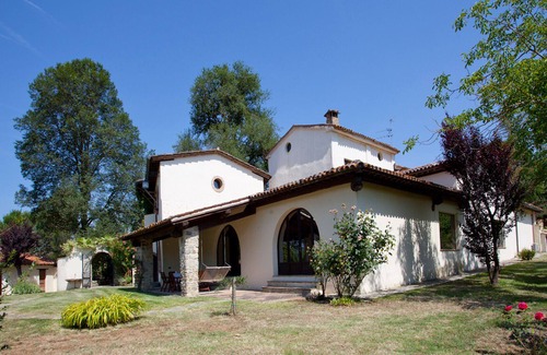 The garden, in front of the main part of the villa, measures 5000 square metres and is almost entirely flat. It consists of lawn, roses, shrubs and tall trees, giving a pleasant and harmonious appearance. The main portico is furnished with table and chairs while about 20 m from the villa is a second attractive portico with outdoor lounge, wood oven and brick-built barbecue.Please notice that photos are taken in spring, therefore flower blossoming, and the colours of the gardens' grass could be different at the moment of your arrival at the villa.