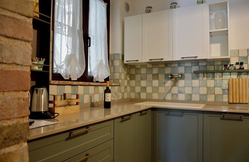 One enters this private villa in the living room with a large dining table, a big wood stove, and an angular sofa for 6. There is an open arch to get to the kitchen. The kitchen has a 5-pit gas cooker, electrical oven, big fridge/freezer combination, Italian espresso machine, a real slicing machine for cold cuts, and a dishwasher.