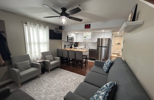Recently renovated modern condo located in desirable midtown OC. Spacious bedrooms allow plenty of room for large families and 2 levels provide privacy. The first floor has a full bathroom and a bedroom with a queen sized bed. Second floor has 2 bedrooms: 1 queen in one bedroom and in the other; 1 full sized bed and a twin over full bunk bed. Additional full bathroom is located on 2nd floor. Condo boasts modern décor and is fully furnished with flat screen Smart TV's in every room so you can stream your favorite shows or listen to music. Fully stocked kitchen including refrigerator, microwave, stove, blender, Kuerig, dishwasher, toaster, iron/board and crock-pot for easy set meals. Laundry room has washer/dryer combo with additional shelves for storage. Condo is steps from the beach and in an area without large hotels so there is always room on the beach even during the busiest time of the year. Enjoy people watching from the deck with plenty of seating. Bus stop is within sight of the condo. Grocery store, TJMaxx, spa, restaurants, gas station and shopping are all within walking distance. Linens are not included but can be rented for an additional cost through local business. We take every precaution to keep our property germ free so you can enjoy your stay without worry. Our home is professionally cleaned and sprayed with disinfectant after every guest. There is no face to face contact, key-less entry with a code created specifically for you for your safety. You must bring your own linens and towels or rent from a local distributor nearby. Must be 25 years or older to rent and renter must be staying on the premises. Parking spot for 1 vehicle. All other vehicles must park on the street.