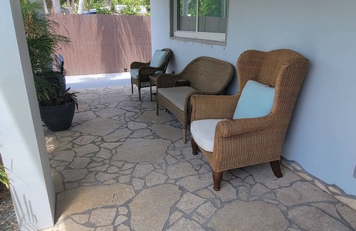 smaller Bedroom with a separate entrance, plus 1 Bathroom, Central Air Conditioning, an enclosed outdoor Washer and Dryer, and covered Parking. The home has been freshly painted and a new Central Air Conditioning unit has been installed.A privacy wall and separate entrance to the unit in the back of the duplex, creates the perfect independent living situation from the main home. Enter to find a user-friendly kitchen, living room, and 1 Bedroom and 1 Bathroom. Step outside to the screened-in covered patio and tropical landscaping!