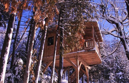 Our tree houses are 18 feet high on stilts in a cozy comfort fully equipped, 4 seasons.